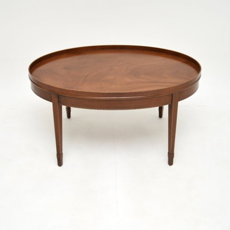 A superb antique coffee table of the highest order, this was made in England and dates from around the 1920-30s.The quality is outstanding, this has a beautiful design and is a useful size. The oval top has a raised gallery, this stands on slightly splayed