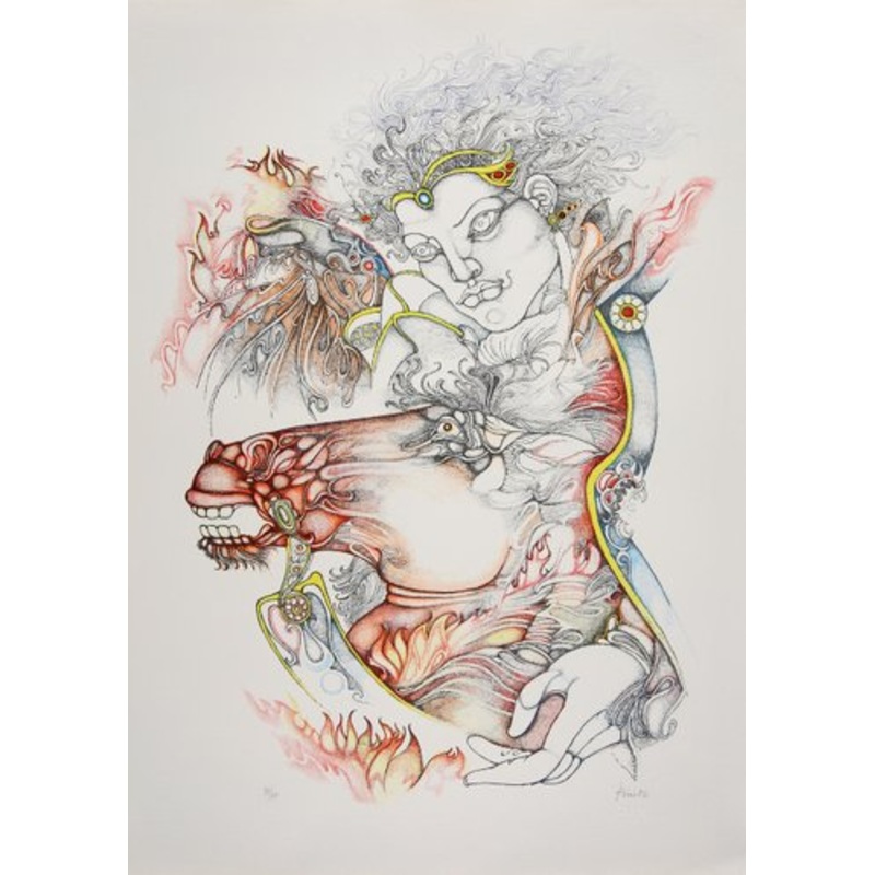 Colour print, "Woman On Horse" by Giuliano PiniMade in 1982Hand-signed by the artist and dated Period 1980 to 1989 Year 1982 Production Period 1980 to 1989 Country of Manufacture Italy Identifying Marks This piece is attributed to the above-mentioned desig