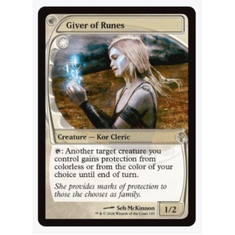 T: Another target creature you control gains protection from colorless or from the color of your choice until end of turn.Rarity:R#:147Card Type:Creature Kor ClericP / T:1 / 2Flavor:She provides marks of protection to those she chooses as family.Casting Co