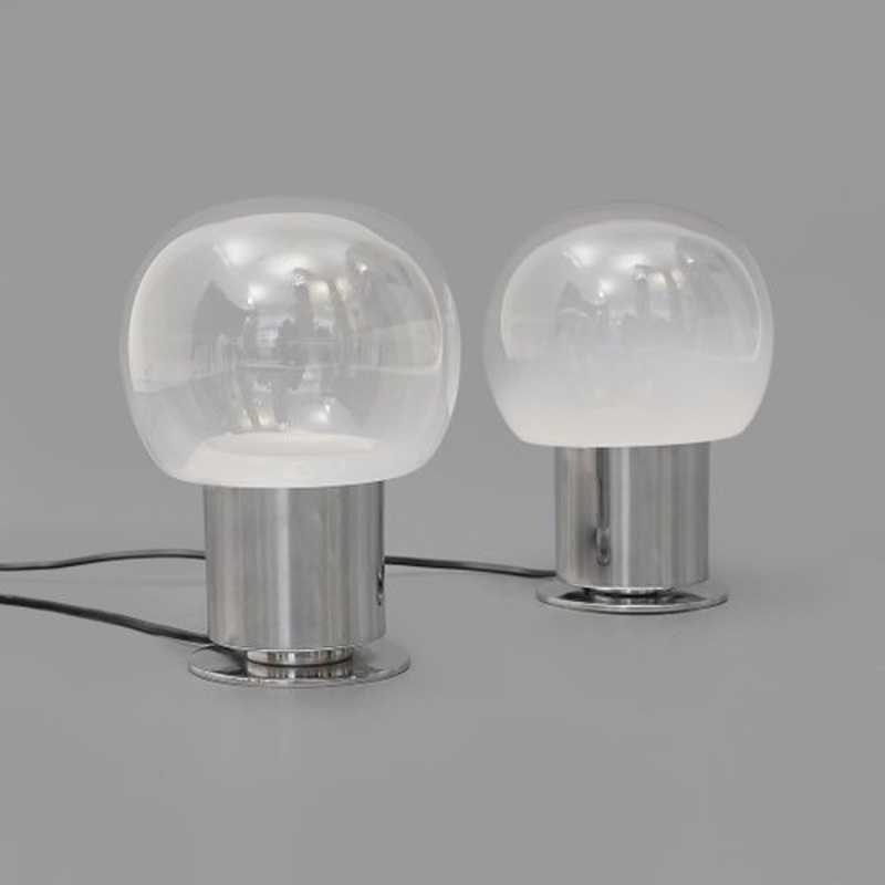 Pair of Italian-made table lamps produced in the 1970s.Chromed metal lamp body.Shaded glass diffusers.Fitted with an E27 bulb.Excellent general condition, the two lamps have slightly different heights and the two glass diffusers have slightly different sha