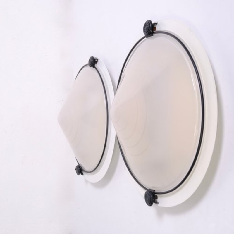 Wall sconce lamps,in satin glass with central circle decoration (see photo)white metal frame.80s 90sDimensions: Diameter 34 cmDepth 14 cm Design Period 1980 to 1989 Production Period Unknown Style Italian Modern Detailed Condition Good This vintage/antique