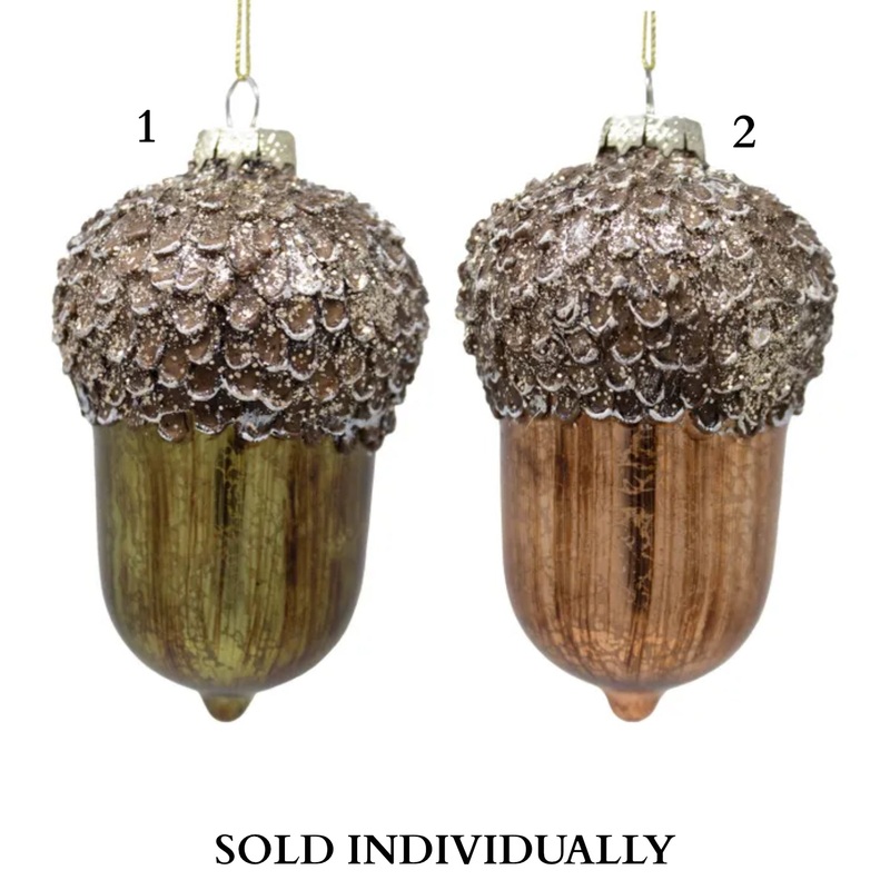These Glass Antique Gold & Green Acorn Ornaments from Kurt Adler are a beautiful and elegant addition to your holiday decor that brings a touch of nature-inspired charm and sophistication to your festive settings. Each ornament features a stunning acorn de