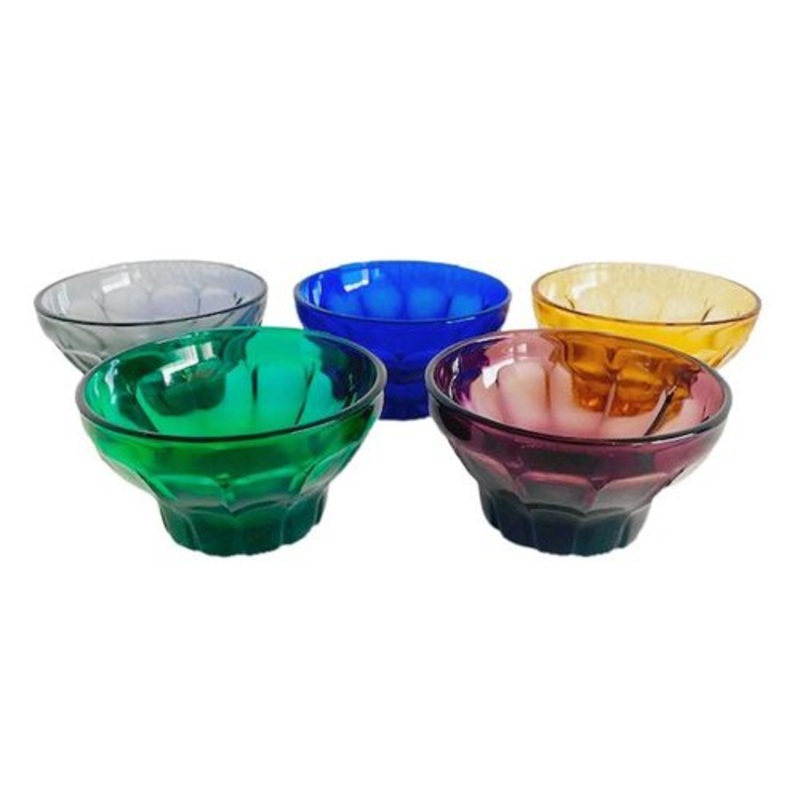 Cool set of glass tableware bowls Carnival designed by M.L.H.M. Verbouquet for Kristalunie Maastricht from the 1960s. rare specials belonging to Carnival glass tableware, pressed crystal in the colors Amethyst, Cobalt, Olive Green, Emerald and Fumi condition; all five excellent. These Carnival bowl glasses have a diameter of 8.6 cm and are 4.8 cm high.