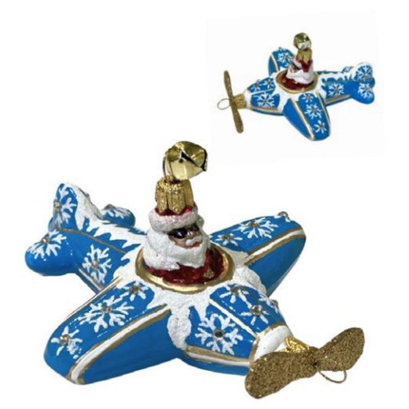 Add a patriotic touch to your holiday dcor with the Glass Holiday Flyer Santa Ornament. This 4.25" hand blown and hand painted glass ornament features Santa piloting an airplane adorned with red, white, and blue stars and stripes. Mouth blown and glittered