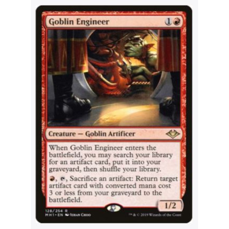 When Goblin Engineer enters the battlefield, you may search your library for an artifact card, put it into your graveyard, then shuffle your library.R, T,, Sacrifice an artifact: Return target artifact card with converted mana cost 3 or less from your grav