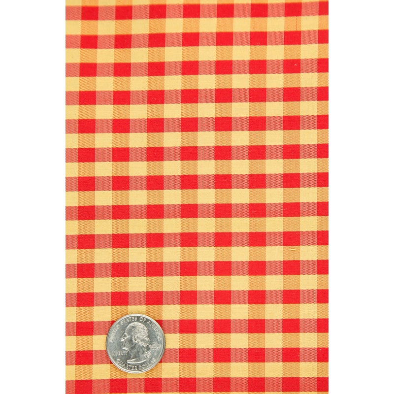 Gold Red Gingham Silk Shantung 396 Fabric is 100% silk fabric, and measures 44 inches in width. This unique and distinctive fabric is well-known for its versatility. It is ideal for evening dresses, jackets, blazers, pants, skirts, blouses, and even eye-ca