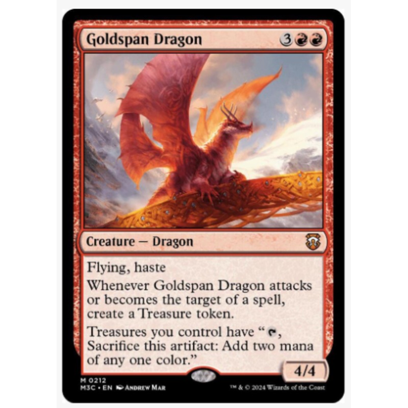 Flying, hasteWhenever Goldspan Dragon attacks or becomes the target of a spell, create a Treasure token.Treasures you control have "T, Sacrifice this artifact: Add two mana of any one color."Rarity:M#:212Card Type:Creature DragonP / T:4 / 4Casting Cost: 3R