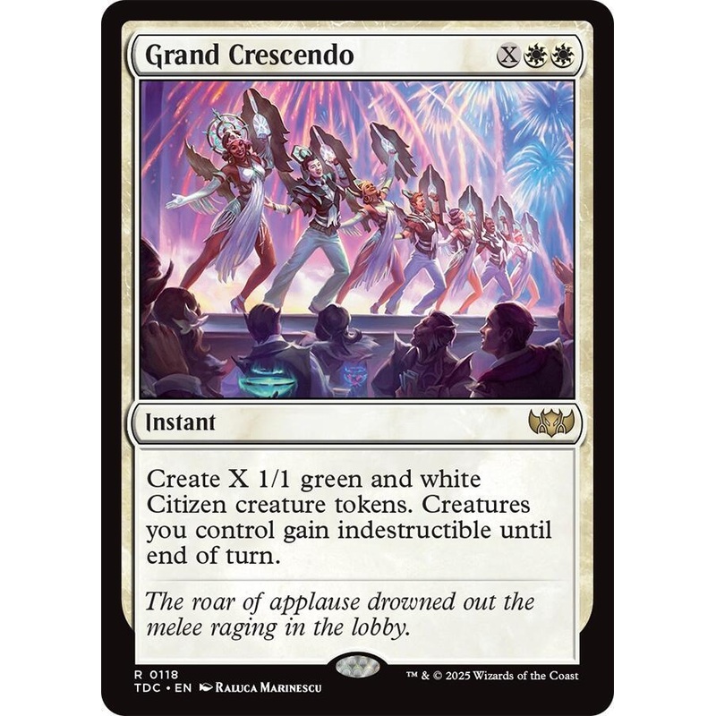 Create X 1/1 green and white Citizen creature tokens. Creatures you control gain indestructible until end of turn.Rarity:R#:118Card Type:InstantFlavor:The roar of applause drowned out the melee raging in the lobby.Casting Cost: XWW