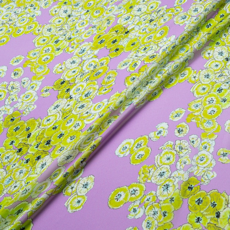 A pretty green floral print on a deep lilac pure silk chiffon by ”B” Daniele. This lightweight silk is the perfect weight for a summer dress, flowing skirt or blouse and available in a variety of colours.