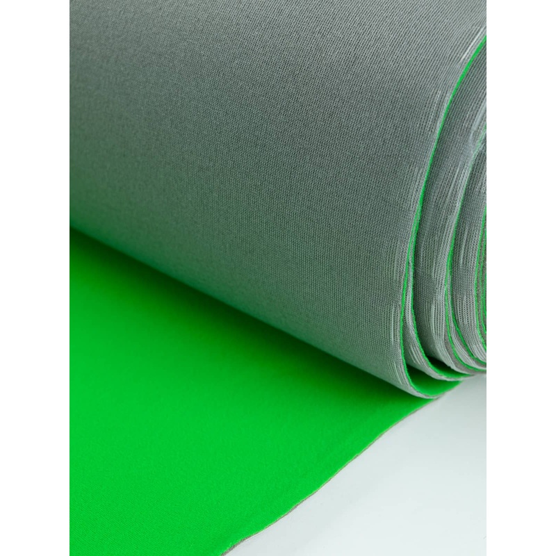 Originally used as green screen fabric, this foam-backed clever fabric boasts a light-medium weight and a malleable yet spongey hand as expected from a foam fabric. The face side (green) is created from a finely knitted jersey/ velour-type (lightly brushed) fabric and is bonded to the mid grey foam backing producing a retentive widthwise stretch. The green velour face- side is super soft and lightly brushed with a short pile.