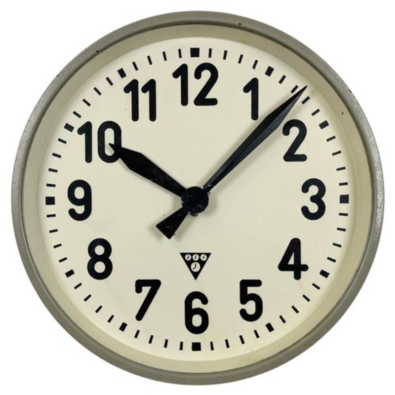 This wall clock was produced by Pragotron in former Czechoslovakia during the 1960s. It features a grey metal frame, an iron dial, an aluminium hands and a clear glass cover. The piece has been converted into a battery-powered clockwork and requires only one AA-battery. The weight of the clock is 2 kg.The diameter is 33 cm.