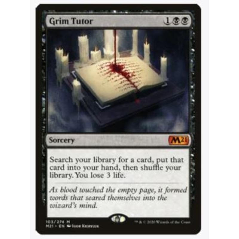 Search your library for a card, put that card into your hand, then shuffle your library. You lose 3 life.Rarity:M#:103Card Type:SorceryFlavor:As blood touched the empty page, it formed words that seared themselves into the wizard's mind.Casting Cost: 1BB