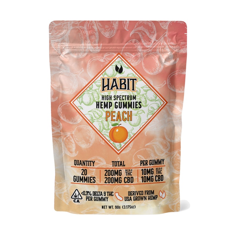 Delta 9 and CBD Infused Peach Gummies! 200mg total Resealable bag Delta 9 and CBD Peach Flavor 20 gummies per bag Fast acting Potent, delicious gummies Description Indulge in a playful kick with our Habit High Spectrum Delta 9 + CBD Peach Gummies! With a p