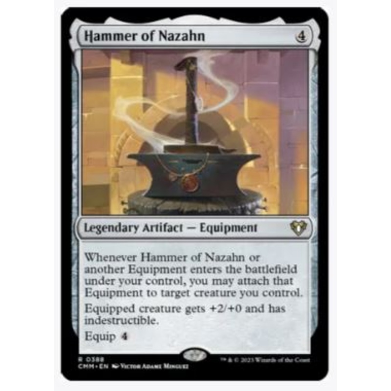 Whenever Hammer of Nazahn or another Equipment enters the battlefield under your control, you may attach that Equipment to target creature you control.Equipped creature gets +2/+0 and has Indestructible.Equip 4Rarity:R#:388Card Type:Legendary Artifact Equi