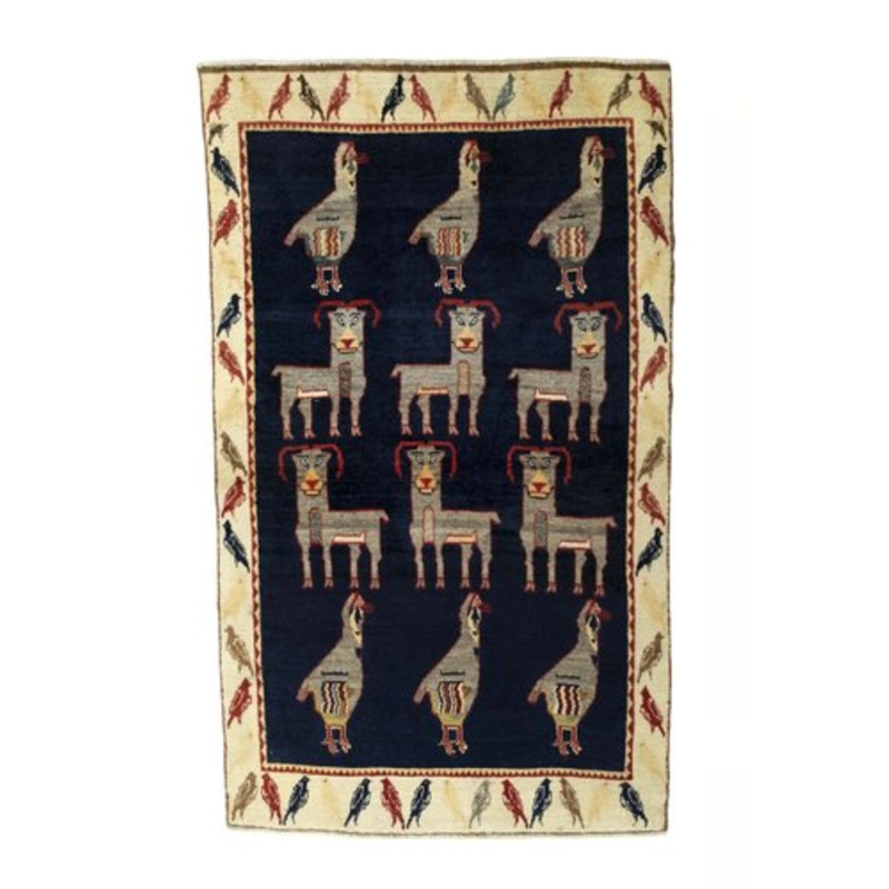 An extraordinary hand-knotted Gabbeh nomadic rug with characteristic animal motifs. The deep blue base color impressively highlights the artistic depictions of goats and birds. The border with stylized bird motifs harmoniously rounds off the design. Made f