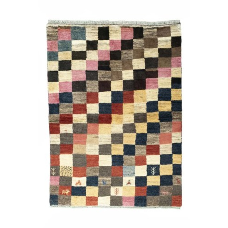 Beautify your living space with our hand-knotted Gabbeh nomad rug, which offers a kaleidoscope of colors and patterns on 162 x 120 cm. This rug features a vibrant patchwork design of colorful squares put together in a harmonious arrangement. Each square varies in color and some are decorated with unique symbolic motifs, giving each piece an individual touch.