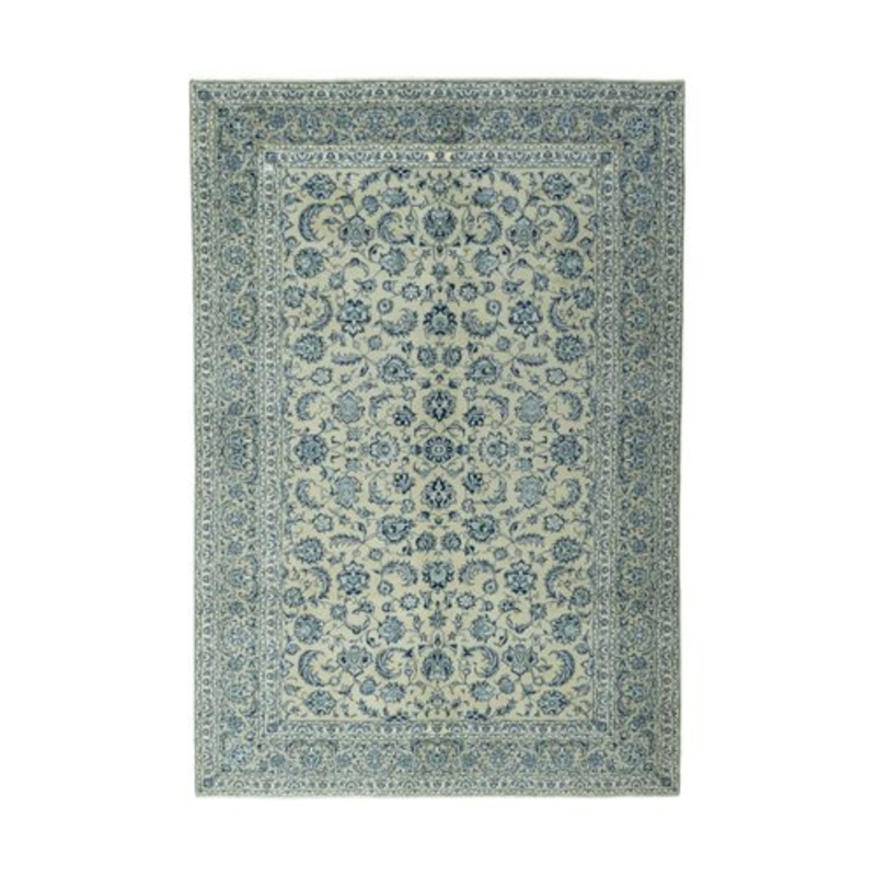 An elegant hand-knotted Kashan cork oriental rug with finely crafted floral patterns in harmonious blue and cream tones. The high-quality cork wool gives it a particularly soft feel and exceptional longevity. The delicate design and fine weaving make this