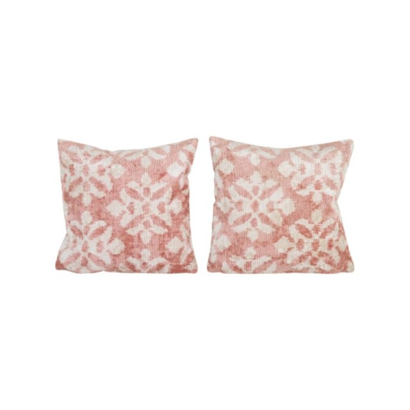 "Decorative Throw Velvet Ikat Pillow-Luxurious cushion cover of handloomed ikat fabric-Insert is NOT included-Color: Pink and Beige-Ikat is an beautiful fabric, every pillow is unique but can also contain small imperfections; the charm of a handmade produc