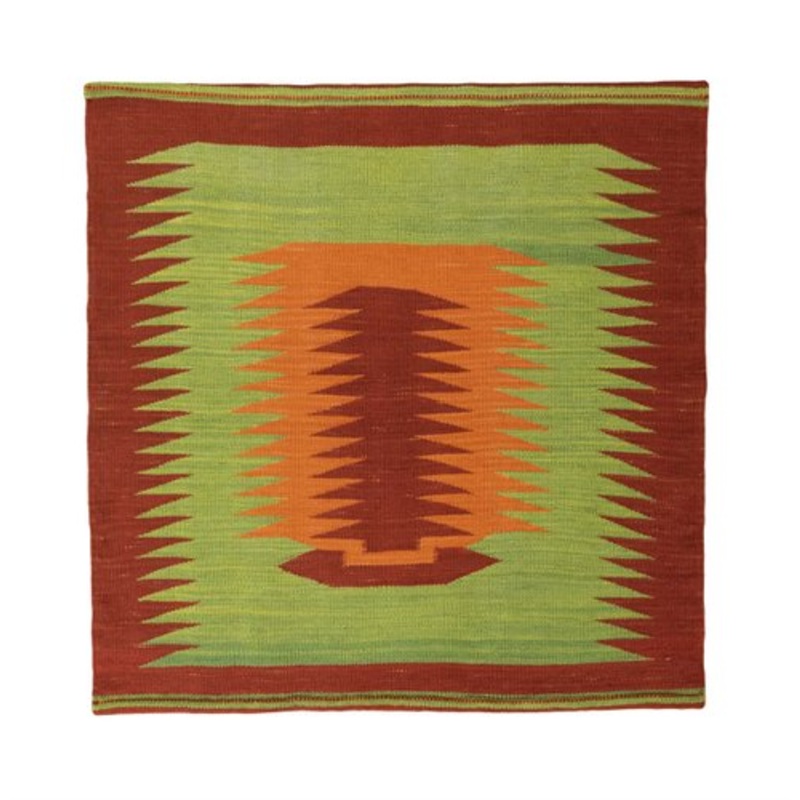 Discover the unique charm of our hand-woven designer kilim, which makes a strong visual statement at 99 x 97 cm. The vibrant pattern, inspired by traditional tribal motifs, features a central column surrounded by dynamic, radiating elements in bold shades of orange, red and green.
