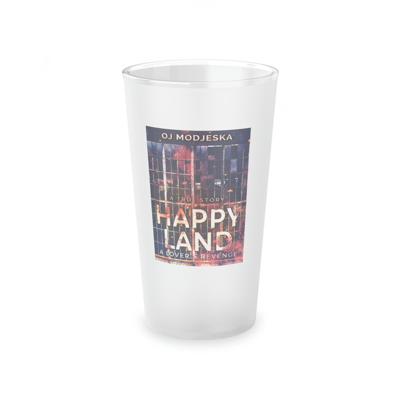 This frosted matte finish pint glass is versatile and dishwasher-safe. The cover art in this pint glass is from OJ Modjeska's book, Happy Land - A Lover's Revenge.