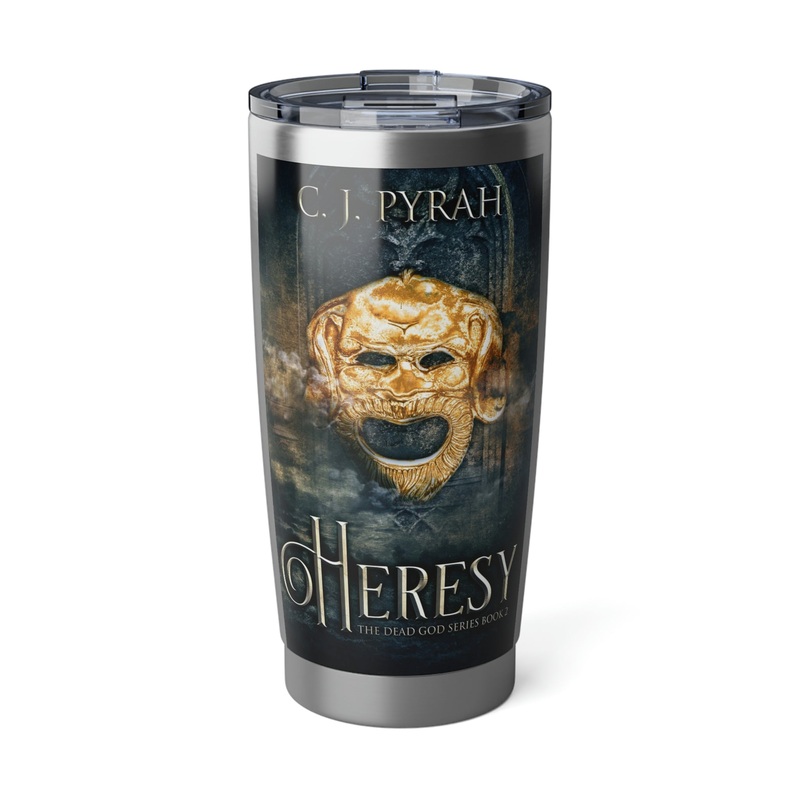 Minimize your plastic footprint with style. This tumbler fits perfectly into car cup holders, and the rubber gasket makes it spill-resistant on bumpier roads. The double-wall insulation makes sure drinks stay at the right temperature until the next pit stop. The cover art in this 20 oz tumbler is from C.J. Pyrah’s book, Heresy.