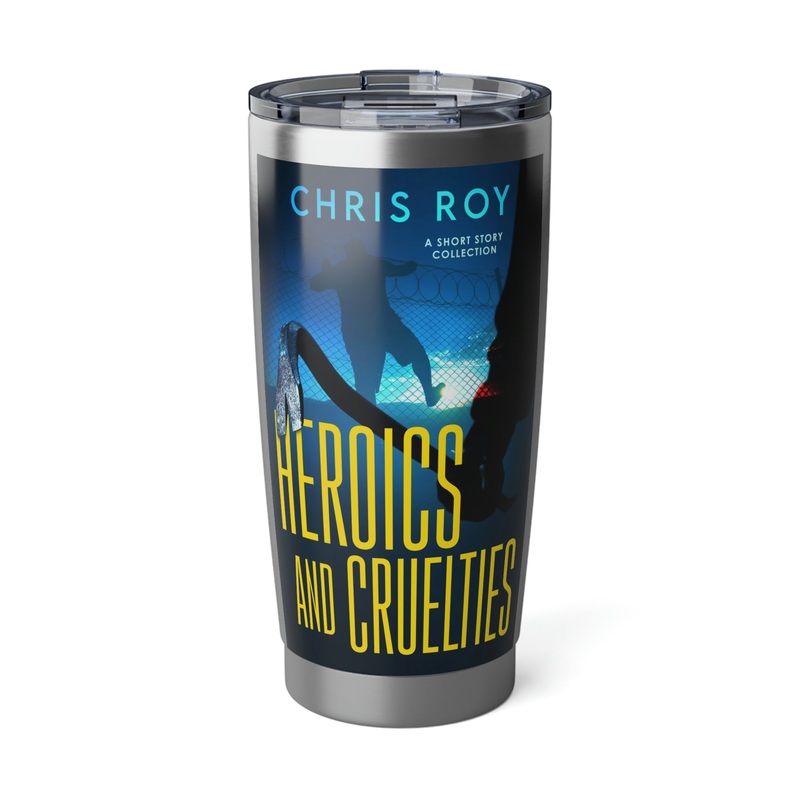 Minimize your plastic footprint with style. This tumbler fits perfectly into car cup holders, and the rubber gasket makes it spill-resistant on bumpier roads. The double-wall insulation makes sure drinks stay at the right temperature until the next pit stop. The cover art in this 20 oz tumbler is from Chris Roy’s book, Heroics And Cruelties.