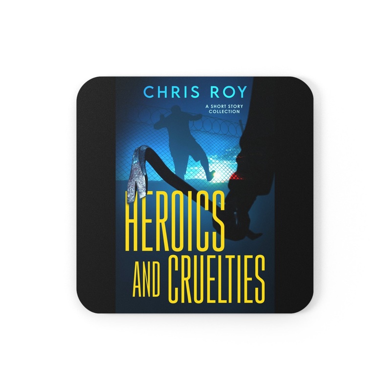 These coasters are made with a high-gloss top and feature a cork back to prevent sliding, and each order comes with a set of four coasters. The cover art in these coasters is from Chris Roy’s book, Heroics And Cruelties.