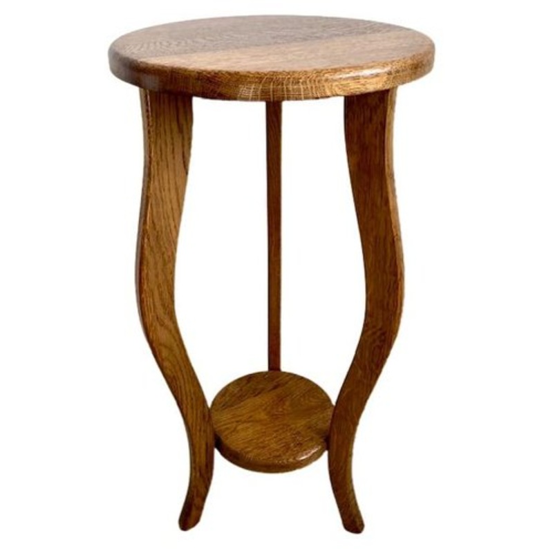 Beautiful vintage high plant table made of solid oak. Nice in combination with a large flower pot. The side table is 65.5 cm high and has a diameter of 32 cm. The seat has a diameter of 25 cm. Production Period Unknown Style Vintage Detailed Condition Good