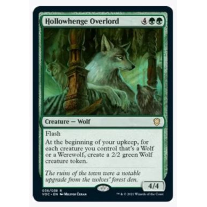 FlashAt the beginning of your upkeep, for each creature you control that's a Wolf or a Werewolf, create a 2/2 green Wolf creature token.Rarity:R#:36Card Type:Creature WolfP / T:4 / 4Casting Cost: 4GG