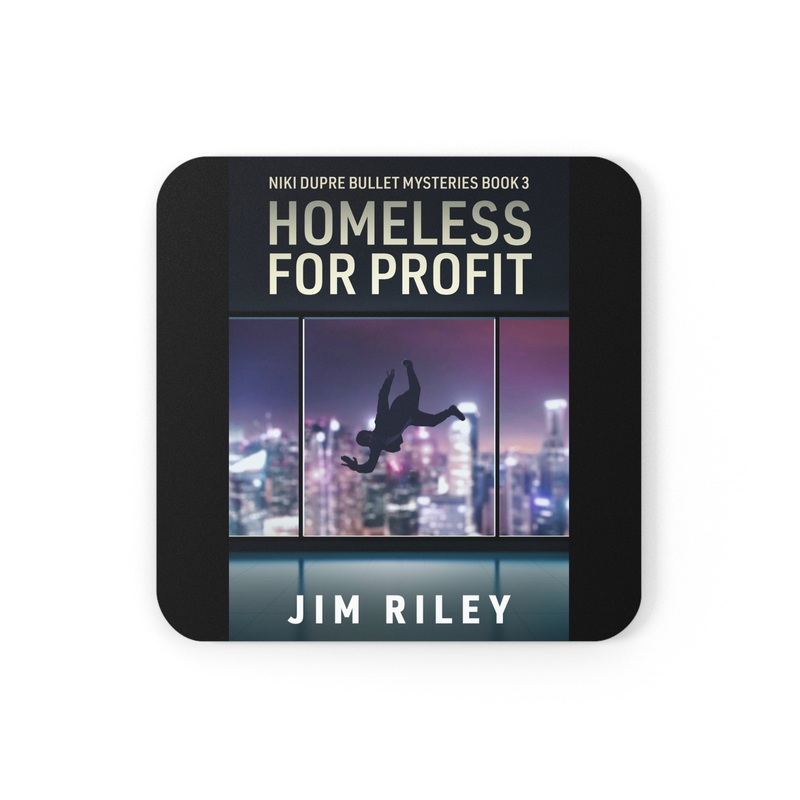 These coasters are made with a high-gloss top and feature a cork back to prevent sliding, and each order comes with a set of four coasters. The cover art in these coasters is from Jim Riley’s book, Homeless For Profit.