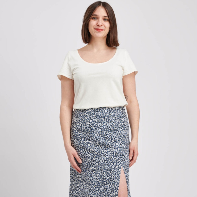 I am Rachel, a 90s-inspired slit skirt. I am slightly flared and I have a slit that starts mid-thigh. I can be sewn in 3 lengths: midi, knee length and mini. I am fitted from the waist to the hips and I fasten with an invisible zip on the left side. Im finished at the waist with a facing. For the mini version, you can decide to include the slit or not.