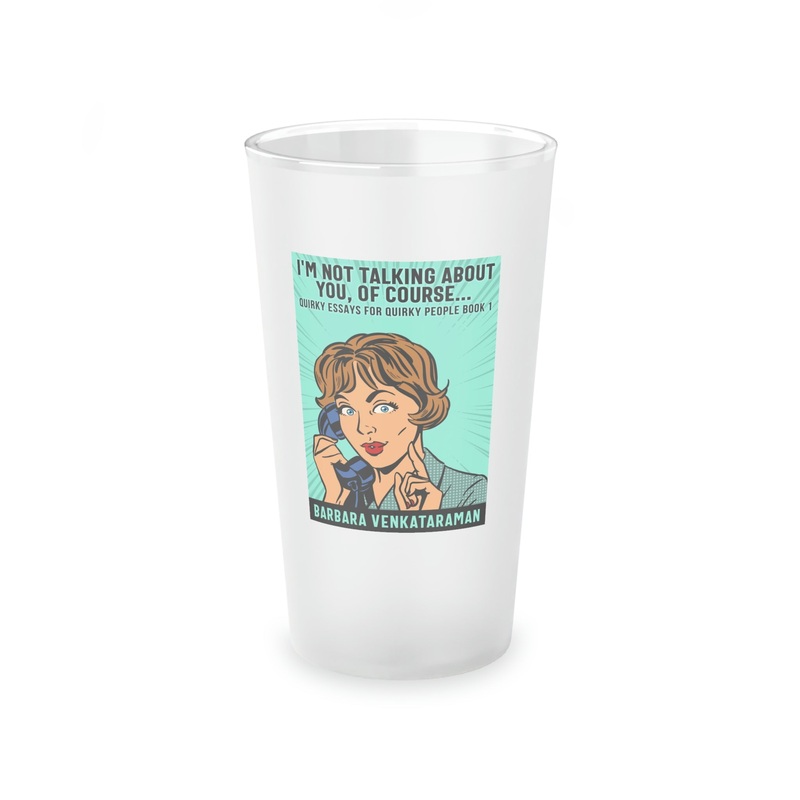 This frosted matte finish pint glass is versatile and dishwasher-safe. The cover art in this pint glass is from Barbara Venkataraman's book, I'm Not Talking About You, Of Course.