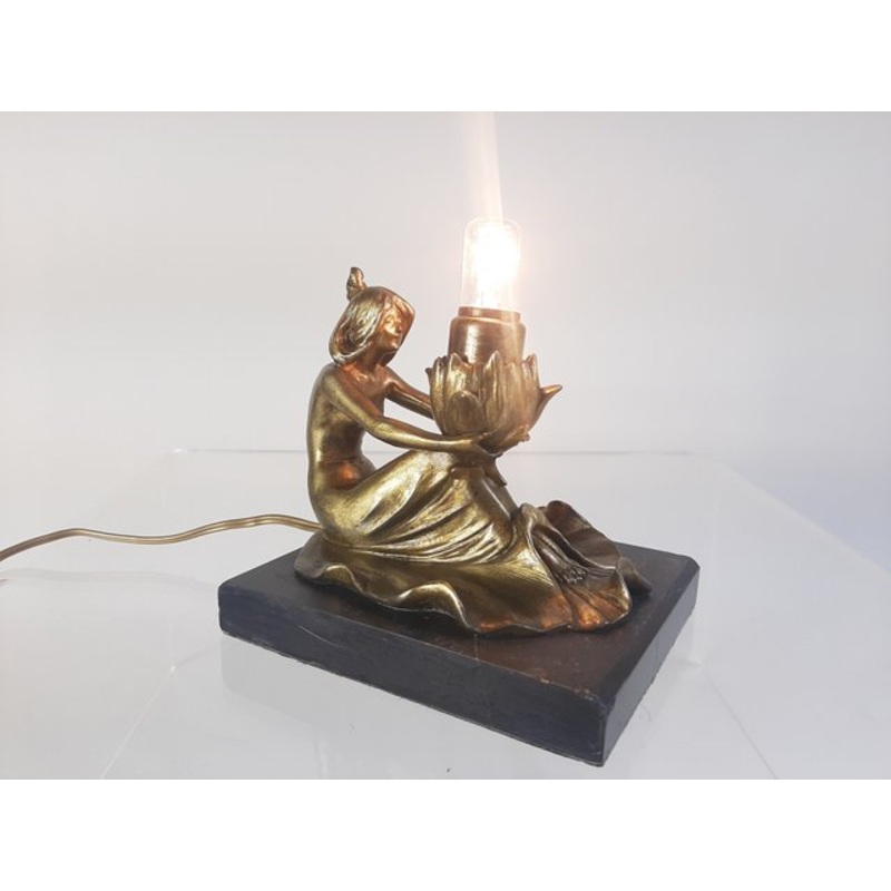Lucien Charles Edouard Alliot (born November 16, 1877 in Paris; March 9, 1967 in Nanteuil-ls-Meaux)Depiction of a scantily clad lady holding a flower and illuminating it. Gilt white bronze (Rgule) on a black marble base. Very finely crafted. Signed "L.Alli