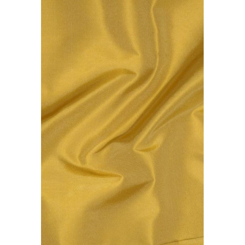 Silk taffeta is a shiny, durable, medium-weight fabric with an elegant drape. It has a crisp and smooth finish, generally used for high-end evening gowns, wedding dresses, fashion linings, and interior use, such as draperies. This Inca Gold Taffeta Silk Fa