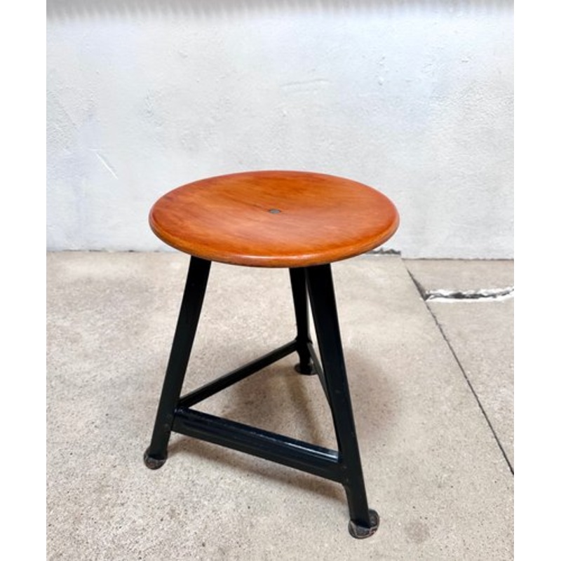 This heavy-duty workshop or atelier stool was manufactured in Germany during the 1920s. The authentic piece features a patinated frame of cold-rolled steel, shaped and riveted. The original seat is made from plywood.