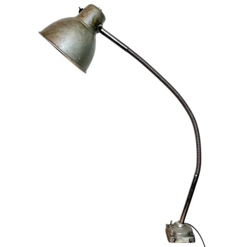 This adjustable gooseneck desk lamp was designed and manufactured in Hungary during the 1960s. It features a green grey hammerpaint metal shade ang base and a chrome-plated flexible arm.The switch is situated directly on the shade.Original bakelite socket