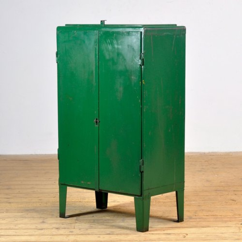 Iron industrial sideboard from the 1960s with a valve on top. One shelve and two drawers on the inside. Treated with rust-preventing oil. The surface is smooth and clean.