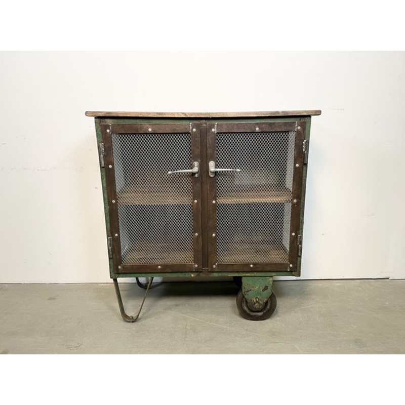 Iron cabinet from the 1960s it features a green iron construction with mesh doors, two wooden shelwes, a wooden top and two original wheels. The weight of the cabinet is 65 kg.