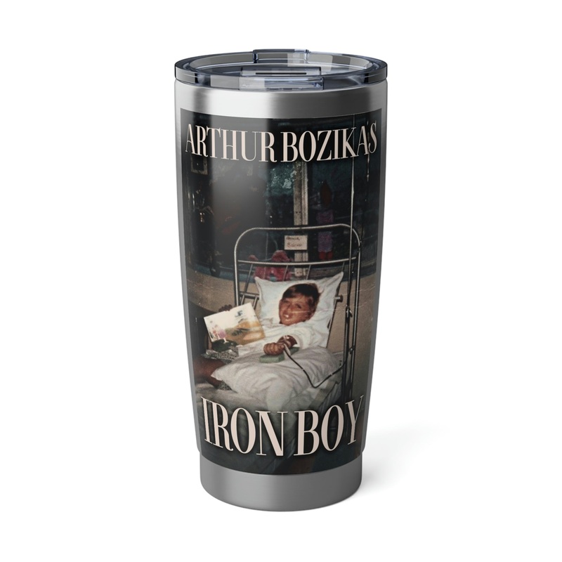 Minimize your plastic footprint with style. This tumbler fits perfectly into car cup holders, and the rubber gasket makes it spill-resistant on bumpier roads. The double-wall insulation makes sure drinks stay at the right temperature until the next pit stop. The cover art in this 20 oz tumbler is from Arthur Bozikas’s book, Iron Boy.