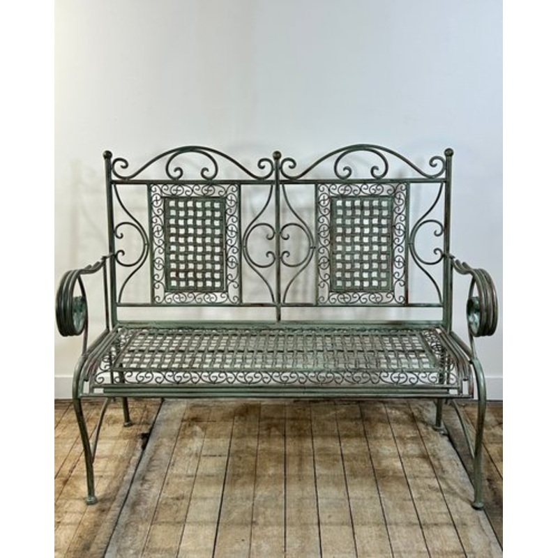 Patinated green folding iron garden bench decorated with crosspieces.size 120 x 48 cmHeight 100cmSeat height 45 cm Design Period 1970 to 1979 Production Period 1970 to 1979 Country of Manufacture France Style French Country, Vintage Detailed Condition Very
