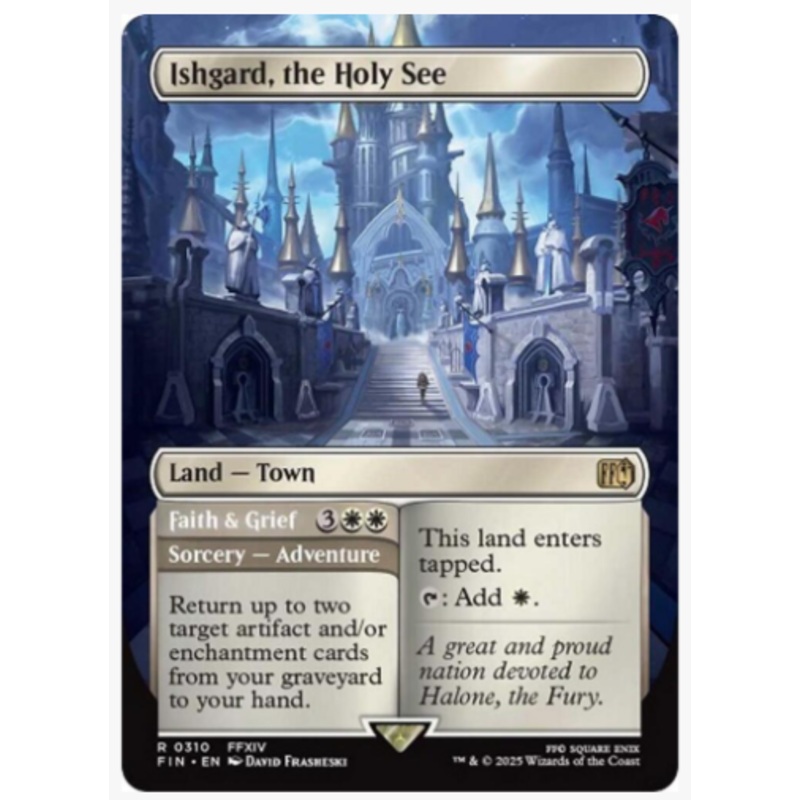 This land enters tapped.T: Add W.Faith & Grief3WWSorcery AdventureReturn up to two target artifact and/or enchantment cards from your graveyard to your hand.(Then exile this card. You may play the land later from exile.)Rarity:R#:310Card Type:Land TownFlav