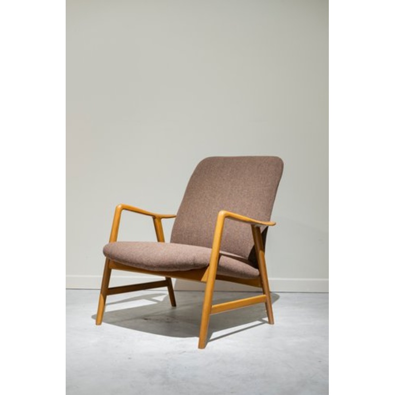 Single armchair with arms made of oak wood with upholstered seat and backrest.