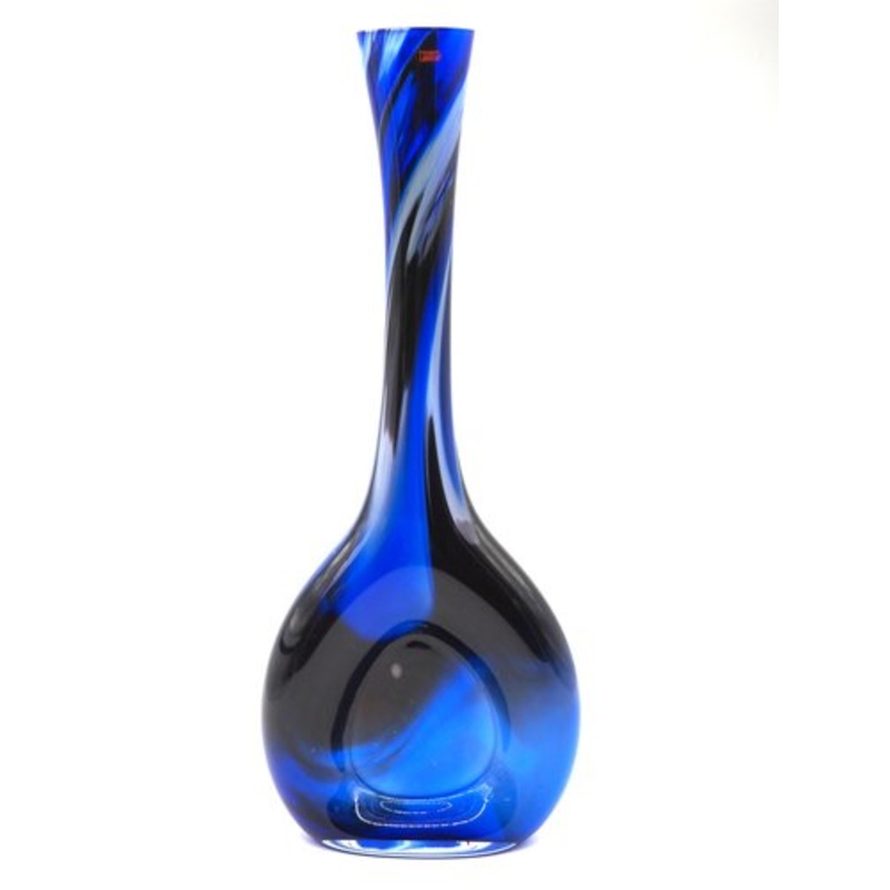 A wonderfully unique and rare vase in a lovely blue color with white and black elements.A stylish eye-catcher in the home.Sleek and featuring a narrow neck with a bulbous base, it's predominantly blue with swirling patterns of black and lighter blue. Manuf