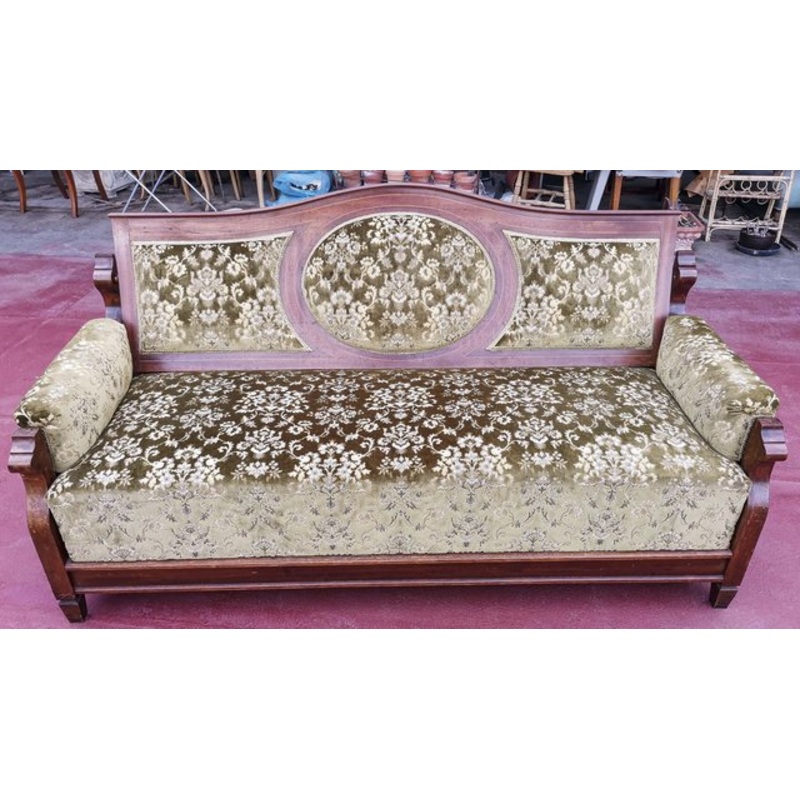 Elegant sofa in green damask fabric and a panel with a heated structure in mahogany wood complete with mechanics to make it read. It occurs in good condition, the bed mechanism is working but still needs general intervention. Measures cm 186 x 76 x h 97 x h sed 48.5 category sofa style art nouveau dimensions: height 97 cm width 186 cm depth 76 cm high sitting 48.5 cm color: red, green, cream. Material: Mahogany gear, Damask fabric Conditions: Worn the vintage object has missing parts and / or defects and may need restored repairs the vintage object, in good condition because it was completely restored.