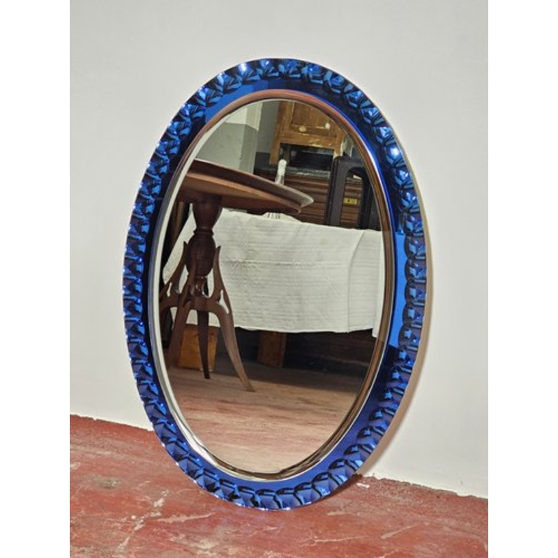 Splendid mirror of Italian manufacture, production attributed to Cristal Arte circa 1960.Embossed and worked blue glass frame.Raised mirror.Everything is in excellent condition, with some slight signs of the present age.Dimensions 83.5x58.5cm Manufacturer