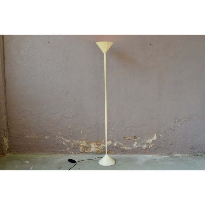 The Lamp 101/1 RL Relux Milano has a very typical design of the Italian productions of the 80s. It is made of beige metal, consisting of two cones bound by a tubular piece in a radical and minimal spirit. The lamp is functional, traces of use and light breaches are visible, especially on the lower part. The cache of the luminous intensity adjustment knob is missing, without it being harmful to its operation.