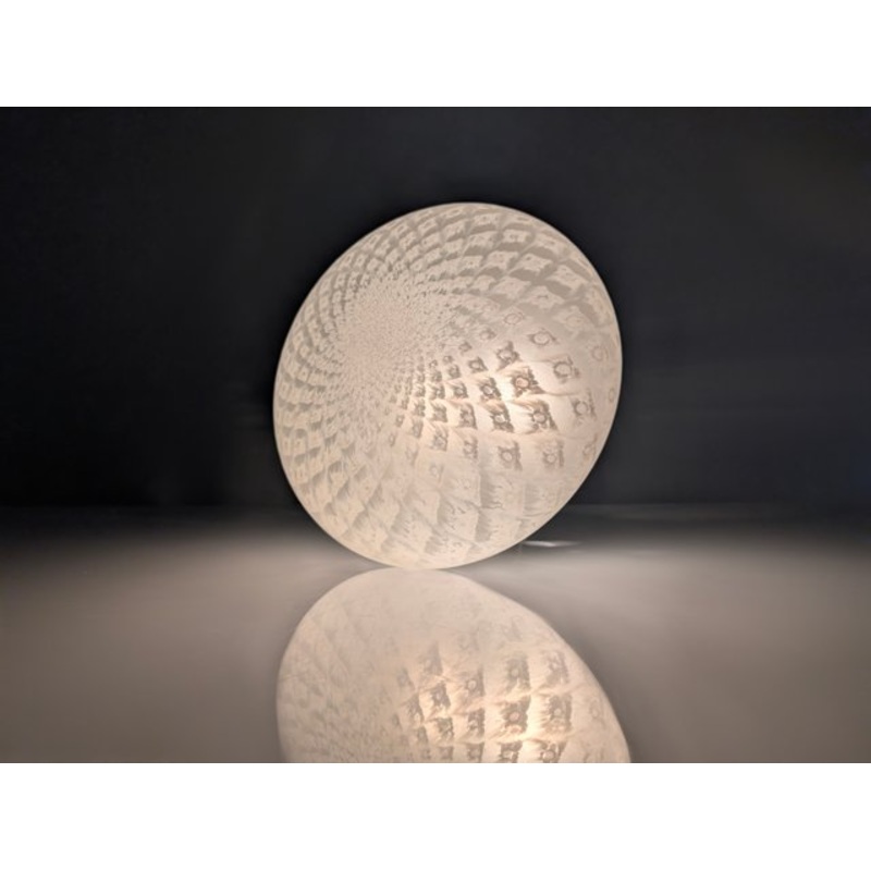 Ceiling lamp made of Murano glass, a magnificent piece of 20th century Italian design. Its delicate handcrafted glass structure exhibits a spiral pattern of rhombuses with internal bubbles that reflects an exceptional technique, achieving a captivating lig