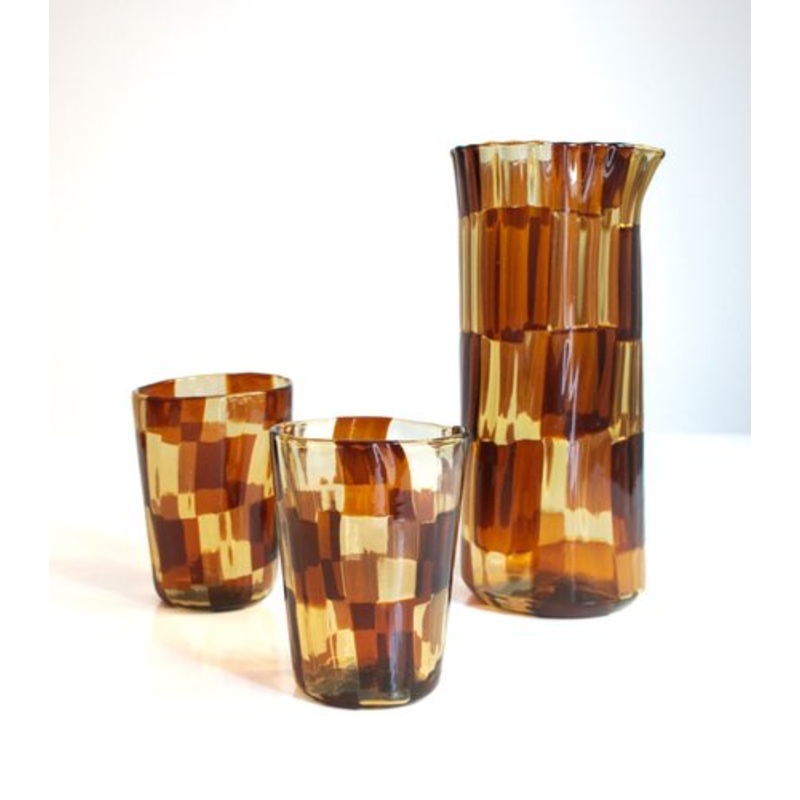 Astonishing drinking set in colored Murano canes made by Angelo Ballarin for Ribes Studio. Gio Ponti glasses are made of canes, in topazio and aamber arranged perfectly thanks to the skill of Maestro Angelo Ballarin. Our glasses all look alike but each pie