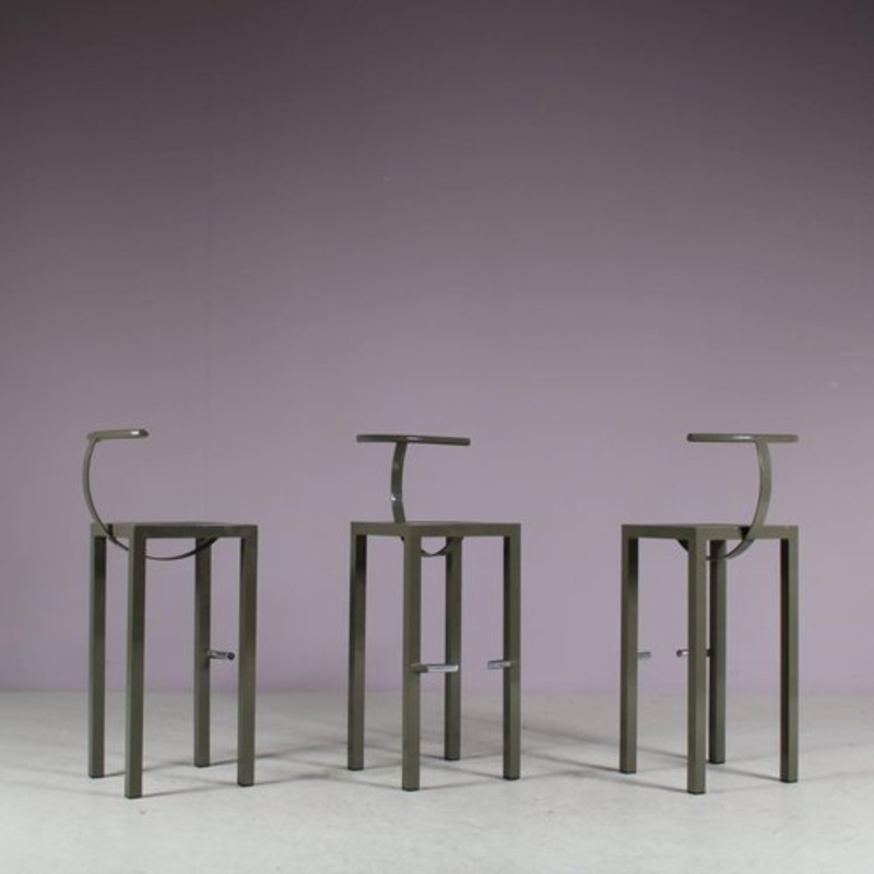 An eye-catching set of three bar stools, model Sarapis, designed by Philippe Starck and manufactured by Driade in Italy around 1980. A modern, most eye-catching design! The stools are made of high quality olive green lacquered metal. They have a rectangula