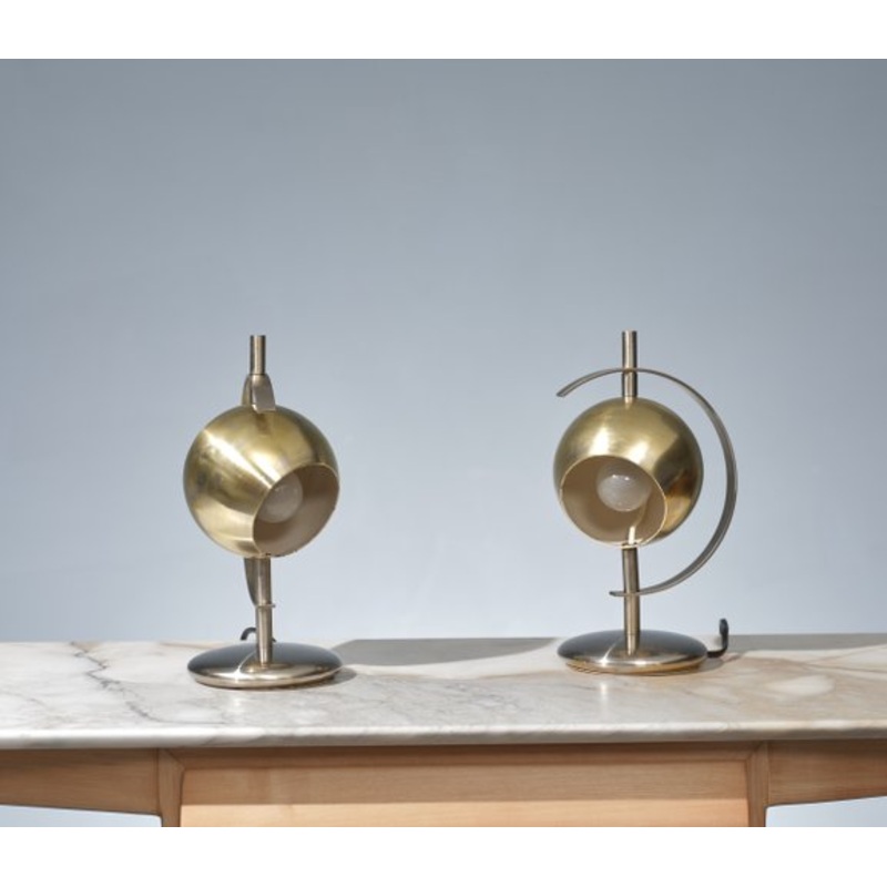Introducing an alluring pair of Italian table lamps from the 1970s, designed with a striking combination of steel and brass-plated steel. These unique lamps feature spherical diffusers that rotate on the axis of their slender stems, allowing for directional light with a futuristic touch. The exterior of the spheres showcases a beautiful aged brass finish that has developed a pleasing patina, subtle signs of oxidation, and a few light dents over the decades, while the interior is lacquered in white with some minor imperfections and paint losses that add character to each piece.